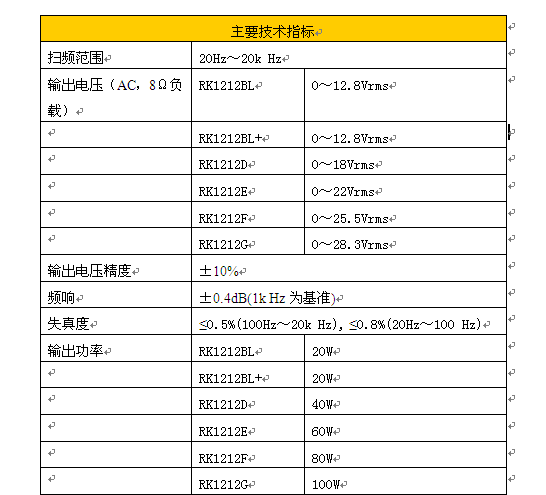 掃頻范圍: 20 Hz~20 kHz精度1×10-4±1個(gè)字 輸出電壓 ( AC ) 0~12.8 Vrms,8 Ω負(fù)載 輸出電壓精度: ±10% 頻響: ±0.4 dB ( 為基準(zhǔn)) 失真度: ≤0.5%(100 Hz~20 kHz) / ≤0.8%(20 Hz~100 Hz) 輸出功率 ( Pmax ):20 VA 掃頻時(shí)間: 1~30s 掃頻比≥1:100